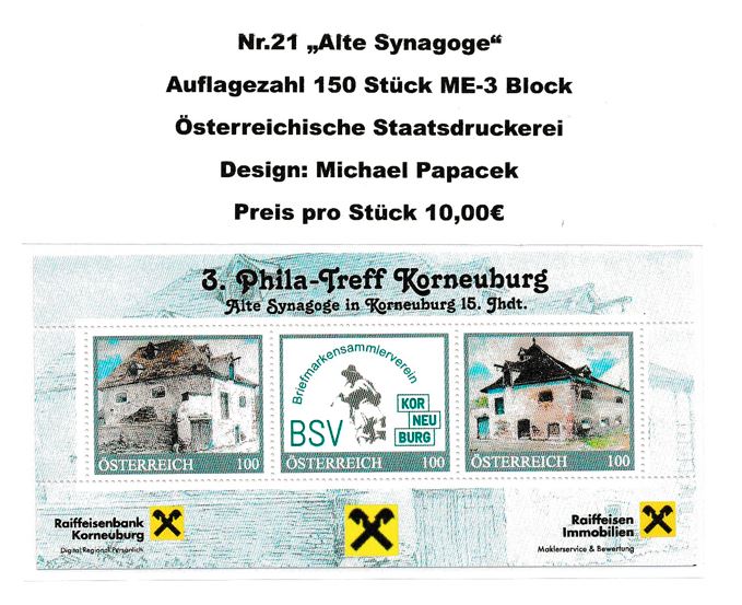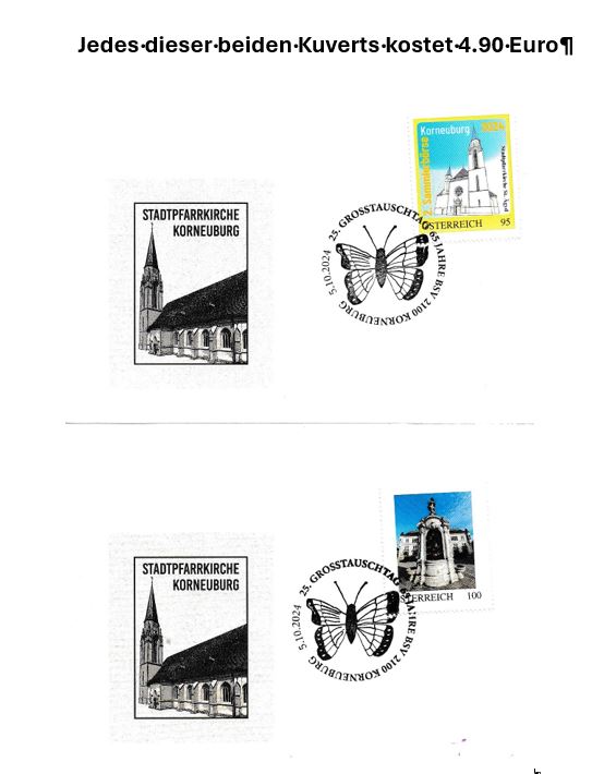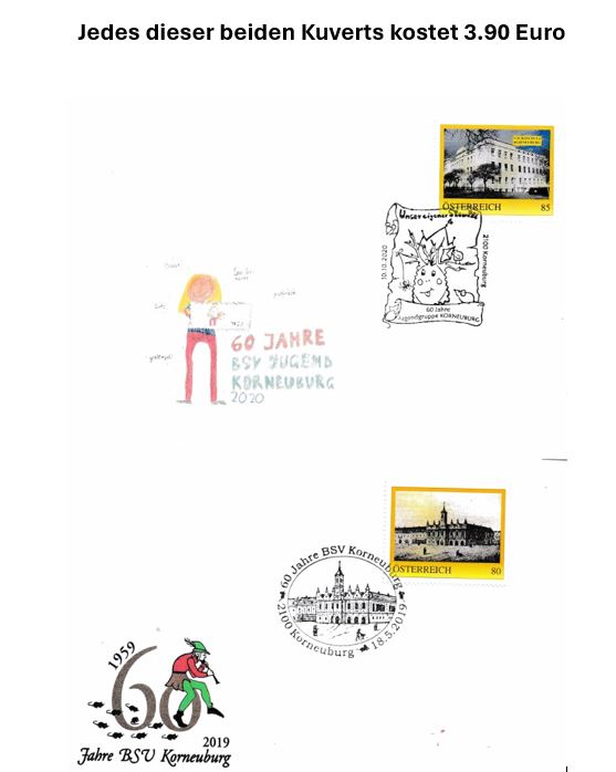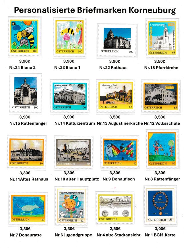 Anbei findet ihr die Auswahl der personalisierten Briefmarken von Korneuburg. Eine Bestellungen ist entweder über E-Mail (bsv.korneuburg@gmail.com) oder über Brief (an BSV Korneuburg, Eberlegasse 20/1, 2100 Korneuburg) möglich. Die Versandkosten betragen 1,50 € (normal) oder mit Reko 4,00€.